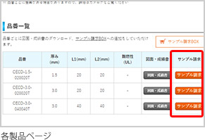 ここから各製品の品番ごとにサンプルをご請求いだけます。